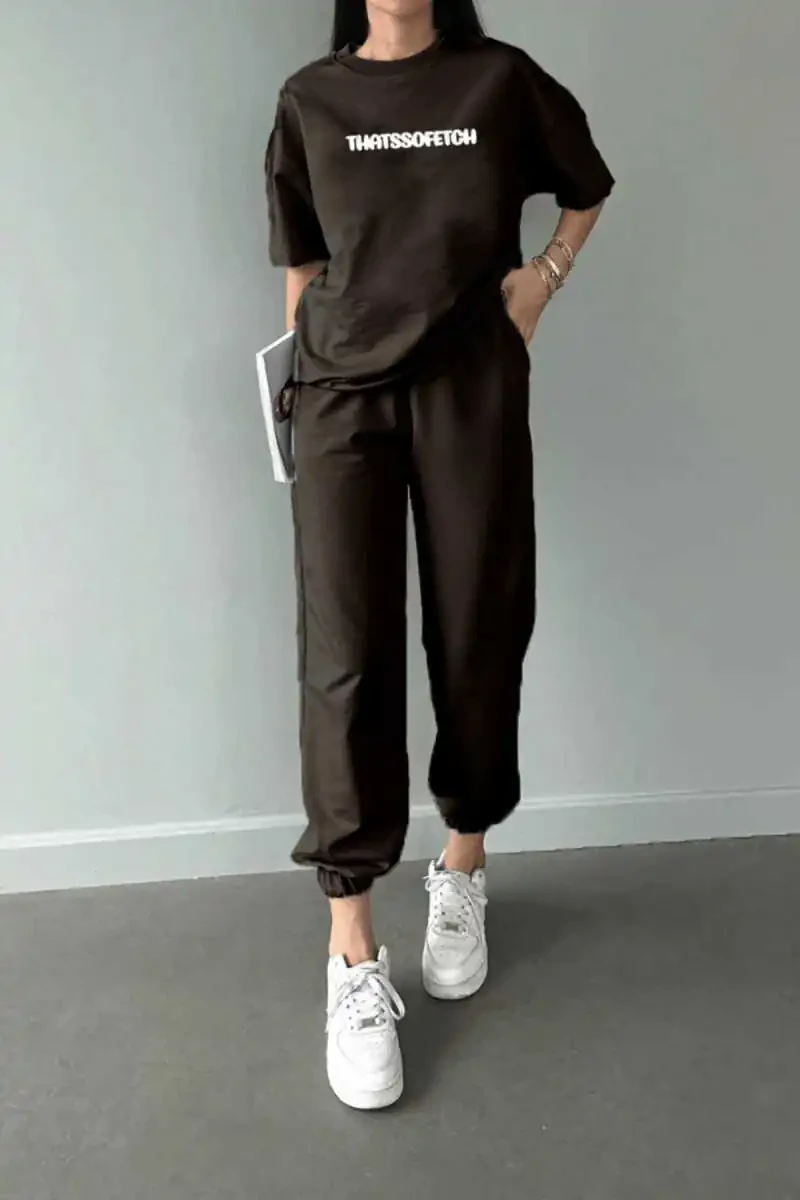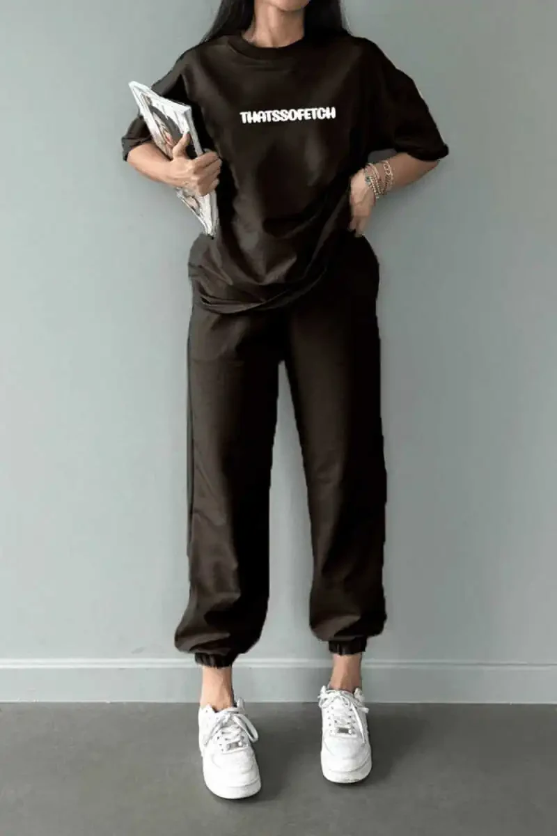 Thatssofetch T-shirt Jogger Shimlari, kundalik uslubingizga zamonaviy teginish qo'shish uchun mukammal tanlov bo'lib, qulaylik va uslubni birlashtiradi. Kofe bosimi bilan bezatilgan ushbu o'lchamli V-bo'yinli t-shirt va jogger to'plami sizning noyob uslubingizni aks ettirishga yordam beradi. Yumshoq va nafas oladigan matodan tayyorlangan, bu to'plam kun bo'yi qulaylikni ta'minlaydi va har qanday faoliyat uchun idealdir.