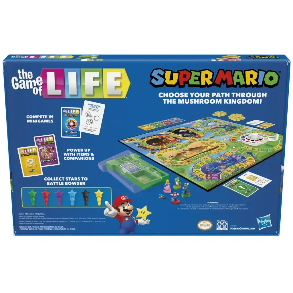 Get ready for a fun journey with The Game of Life: Super Mario Edition, which brings the exciting adventure of the Super Mario world to the board game! This game is a 2-4 player board game designed for children aged 8 and up and families. Choose from your favorite Super Mario characters Mario, Luigi, Peach and Yoshi and embark on an unforgettable adventure in the Mushroom Kingdom. Collect gold as you progress through the game board, power up with special items and companions, and prepare for the final battle with Bowser! Gain an edge over your opponents by playing fun mini-games like Rock Paper Scissors, Thumb Wrestling and Spin-Off throughout the game. As you approach Bowser's Castle, you'll need to buy stars to power up your battle spin. Each star you collect adds 1 point to your spin total, and you'll need to make a spin higher than 12 to defeat Bowser and win the game. In this game where strategy, luck and fun come together, you will experience unforgettable moments in the colorful world of the Mushroom Kingdom. A perfect option to spend quality time with your family and friends, The Game of Life: Super Mario Edition combines the classic board game experience with the unique magic of Super Mario.