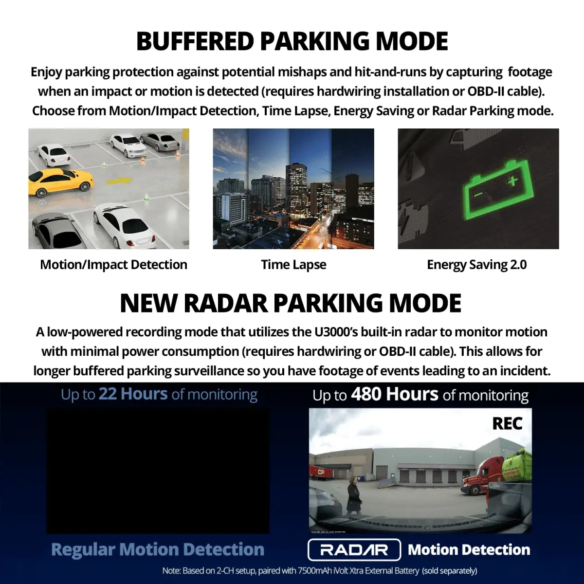 Enjoy unparalleled parking protection with THINKWARE all-new U3000 dash cam. The built-in radar enables the dash cam to monitor motion and impact with minimal power consumption while in parking mode, allowing for prolonged surveillance of your parked vehicle. Featuring Sony's next-generation STARVIS 2 sensor, the U3000 benefits from the latest advancements in recording technology to capture stunning daytime and nighttime footage in 4K UHD. Thanks to the THINKWARE-connected companion app, you can keep tabs on your vehicle with features like Remote Live View, locate the vehicle, and impact notification when the U3000 is connected to the internet.