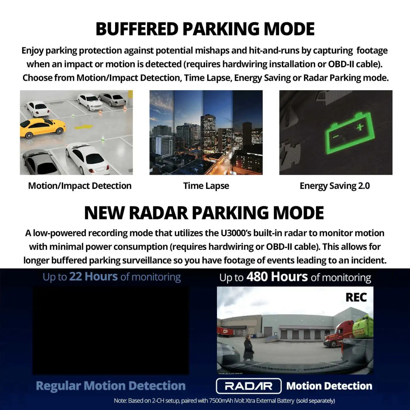 THINKWARE'in yepyeni U3000 dash kamerası ile eşsiz park koruma özelliğinin keyfini çıkarın. Dahili radar, park modundayken minimum güç tüketimiyle hareketi ve darbeyi izleyerek park halindeki aracınızın uzun süreli gözetimini sağlar. Sony'nin yeni nesil STARVIS 2 sensörüne sahip U3000, 4K UHD'de çarpıcı gündüz ve gece çekimleri yapmak için kayıt teknolojisindeki en son gelişmelerden yararlanır. THINKWARE'e bağlı yardımcı uygulama sayesinde, U3000 internete bağlıyken Uzaktan Canlı Görüntü gibi özellikler aracılığıyla aracınızı takip edebilir, aracı bulabilir ve darbe bildirimi alabilirsiniz.