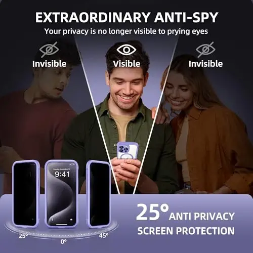 TIESZEN iPhone 15 Pro kılıfı, MagSafe uyumlu, dahili gizlilik ekran koruyucu ve kamera koruması, anti casus tam vücut toz geçirmez darbeye dayanıklı sert telefon kılıfı 6.1", açık mor.