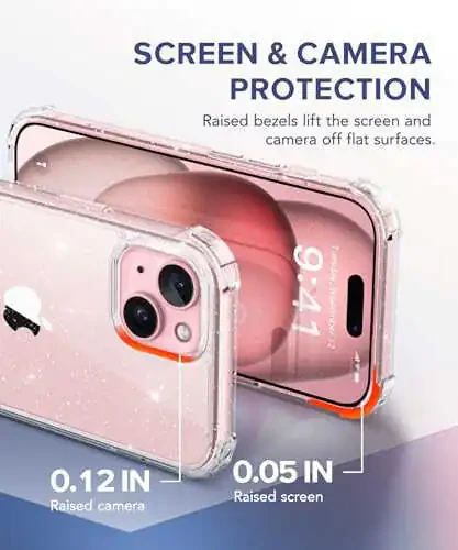 TIESZEN 5 ta 1 ta iPhone 15 bilan mos keladigan Glitter qopqog'i, 2 ta ekran himoyachisi + 2 ta kamera linzasi himoyachisi bilan, [Sariqlashmaslik] Shaffof yaltiroq yupqa zarba qarshi telefon qopqog'i ayollar uchun 6,1 dyuym, porloq shaffof