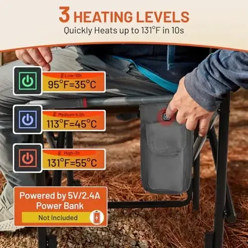 TIMBER RIDGE Heated Aluminum Oversized Camping Chair offers excellent comfort and convenience for your outdoor activities. Thanks to its lightweight and portable design, this director's chair is ideal for camping, picnics, garden parties and more. Although the chair weighs only 7.28 lbs, it can support up to 400 lbs thanks to its sturdy aluminum frame. Moreover, it can be easily carried and stored thanks to the carrying strap. This chair is not only comfortable, but also offers you warmth in cold weather thanks to its rapid heating feature. Thanks to the dual-zone heating system, the back and seat area can heat up to 131°F in just 10 seconds. You can personalize your comfort with three different adjustable heat settings (95°F, 113°F, 131°F) according to your needs. TIMBER RIDGE camping chair also stands out with its practical features. The table on the side is ideal for placing your drinks or snacks. There is also a storage pocket to help you keep your belongings organized. You can feel comfortable even during long-lasting events with its wide 25 1/4 inch seating area and supportive armrests. Whether you're on a camping trip or relaxing in your garden, this chair offers you the ultimate in comfort and functionality. Moreover, thanks to our additional protection plans, you can secure your product. Our comprehensive protection plans, which start 30 days after the purchase date, cover material and workmanship defects, stains, tears and more. Thanks to the simple and fast claim process, you can easily have your product repaired, replaced or refunded. TIMBER RIDGE heated camping chair will take your outdoor experiences to the next level by combining durability, comfort and convenience.