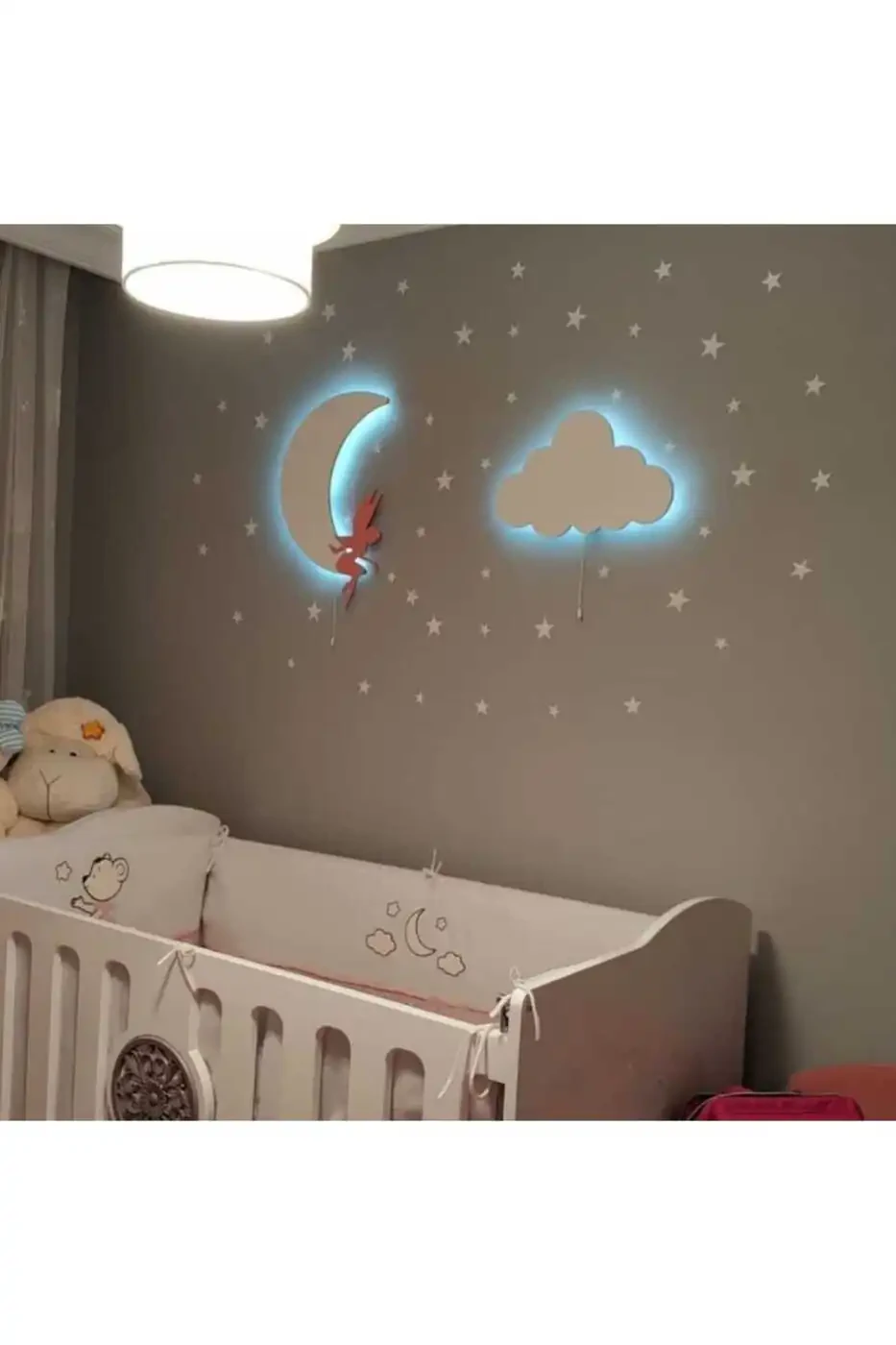 Tinkerbell Moon And Cloud Wooden Baby Room Lighting is carefully crafted from natural wood material. The moon and cloud figures are designed to nurture your child's imagination and creativity. The soft light of the lighting creates a comfortable sleeping environment without straining your child's eyes.