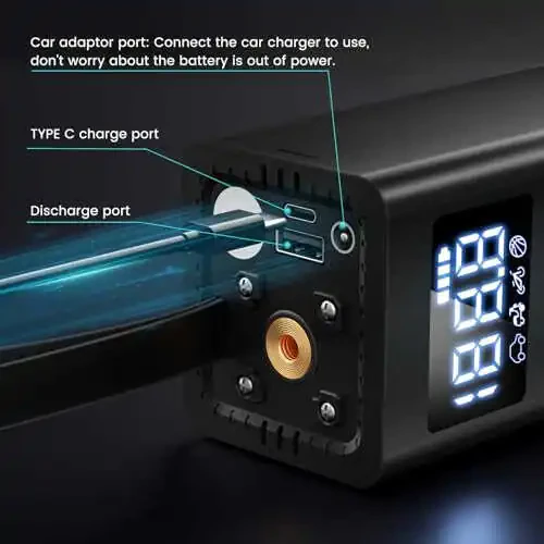 This portable air compressor offers everything you need to inflate your tires on the road or at home. Its compact size, powerful performance and versatile features make it a must-have tool for every car owner. Please note, this device is not suitable for medium and large heavy-duty trucks. If you have any questions, please do not hesitate to contact us.