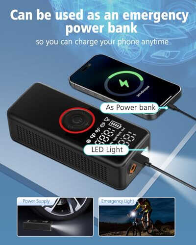 car tires, portable air compressor, tire inflation, power bank, emergency light, accurate pressure gauge
