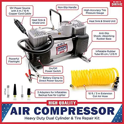 This product is a complete kit that includes everything you need to inflate your tires and repair minor tire damage. Please read the instruction manual carefully that comes with the product. Check your tire pressure before using the device and make sure you comply with the manufacturer's recommended pressure levels. Regular maintenance and proper use will extend the life of your air compressor.