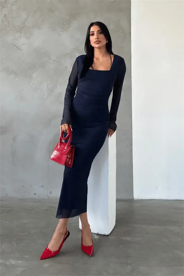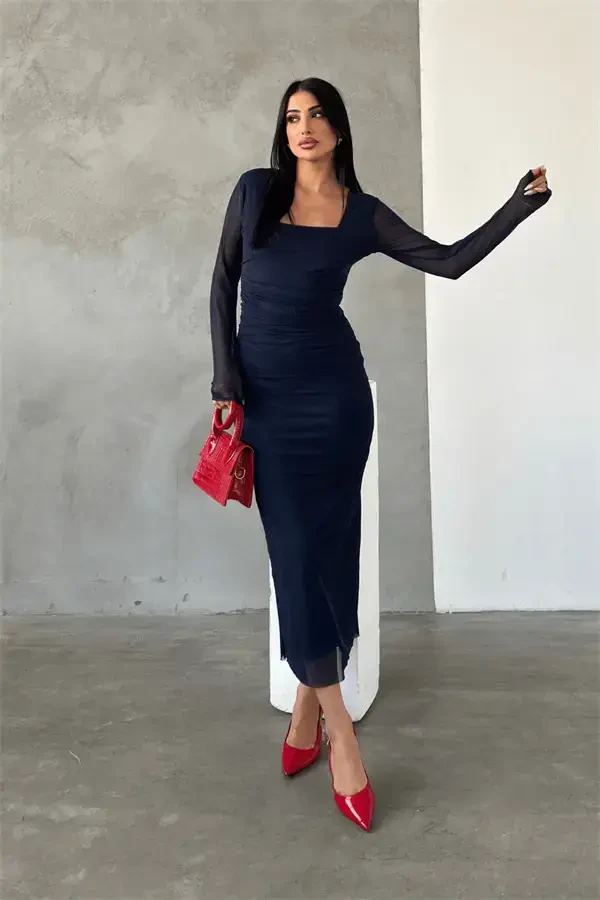 Тюлевое платье-карандаш с драпировкой - NAVY - сочетайте элегантность и изысканность! Это платье особого дизайна сочетает в себе благородство темно-синего цвета и легкость тюлевой ткани, что позволит вам блистать в любой обстановке. Юбка-карандаш идеально подчеркивает ваши формы, а драпировка придает платью движение и современный вид. Это платье идеально подходит для широкого спектра случаев, от званых ужинов до деловых встреч, от коктейлей до особых случаев, и станет незаменимой частью вашего гардероба.Тюлевая ткань платья мягко прикасается к вашей коже, а подкладка гарантирует, что вам будет комфортно в течение всего дня. Благодаря своей эластичной структуре оно идеально сидит по фигуре и не сковывает движений. Дизайн без нагрудника позволяет использовать различные варианты бюстгальтеров, а отсутствие молнии облегчает надевание. Стандартный крой обеспечивает идеальную посадку и создает стильный внешний вид.Глубина темно-синего цвета позволяет легко сочетать это платье с любыми аксессуарами. Вы можете создать более шикарный образ с туфлями на каблуках или более непринужденный стиль с сандалиями. Вы можете подготовиться к особому мероприятию, дополнив платье элегантным ожерельем и серьгами, или создать простой и элегантный образ с минимальными украшениями для повседневного использования. Тюлевое платье-карандаш с драпировкой - идеальный выбор для стильных женщин! Почувствуйте себя особенной в каждый момент с этим платьем, которое сочетает в себе комфорт и элегантность. Не пропустите это платье, которое станет звездой вашего гардероба!