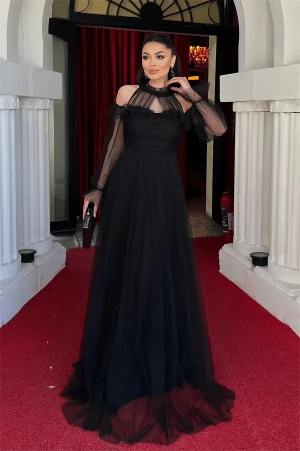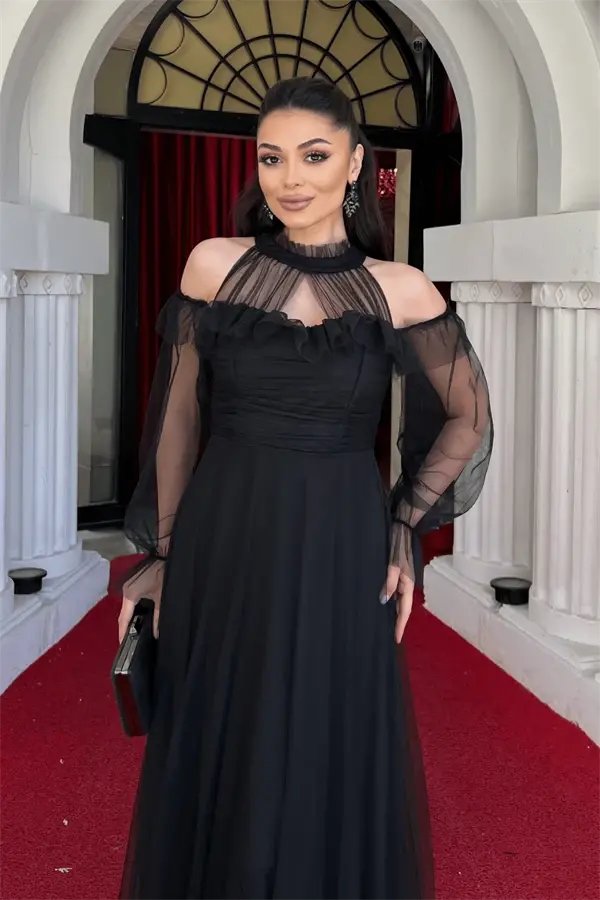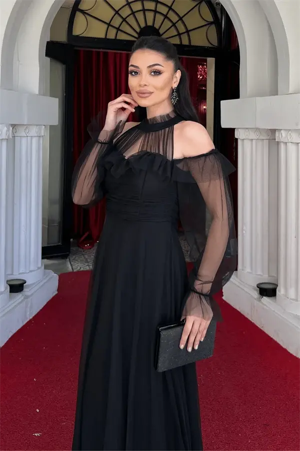 Тюлевое платье с оборками | Элегантная модель с длинными рукавами на подкладке
