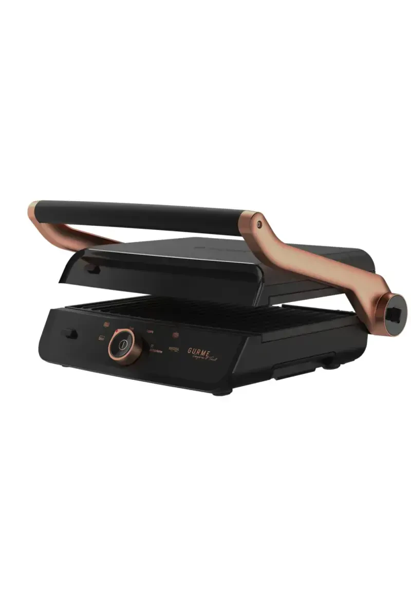 Heat-resistant exterior, 2 slice capacity, non-stick cooking plates, easy to clean, upright storage, rapid heating, automatic thermostat, power indicator light.