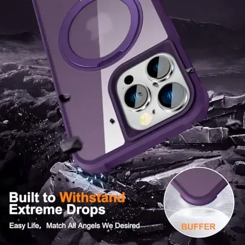 TOKVANZ iPhone 15 Pro uchun 360° aylanuvchi magnitli halqali stendli g'ilof [Mag-Safe mos] [Harbiy darajadagi himoya] Shaffof matli telefon g'iloflari ayollar va erkaklar uchun 6,1'', binafsha