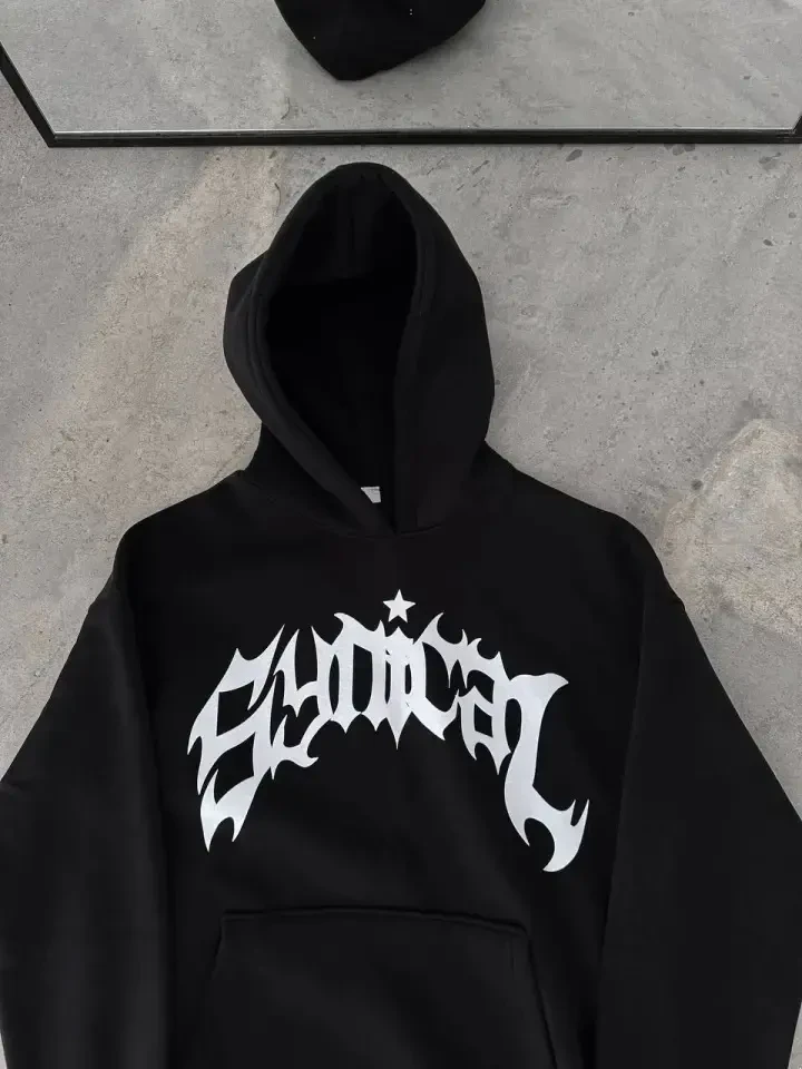 Oversize kesim, Kapüşonlu, Baskılı, Üç iplik kumaş, Rahat kalıp.