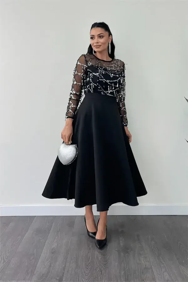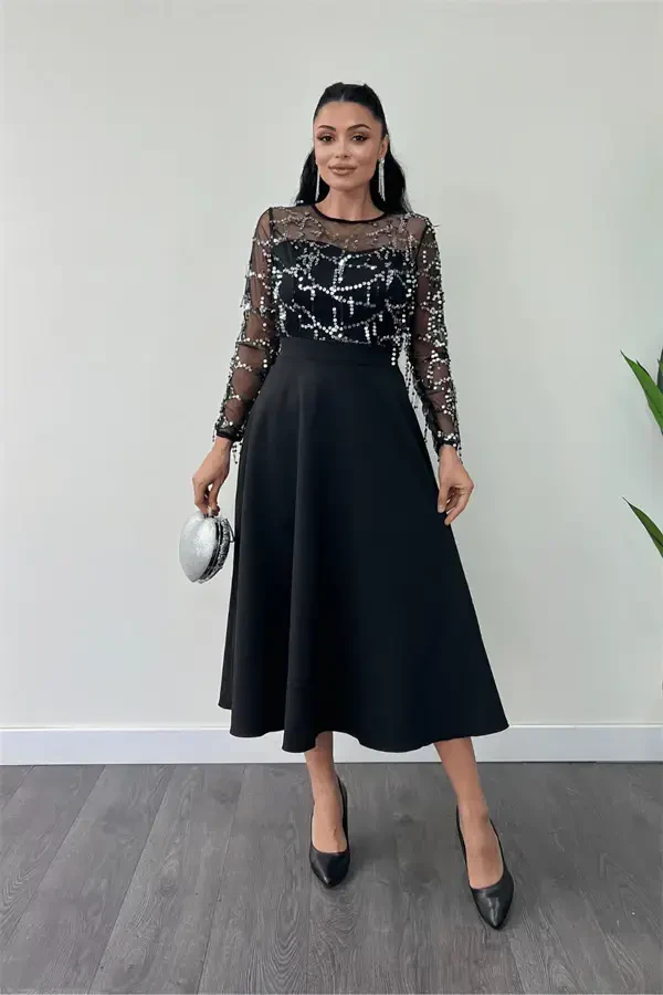 Meet our "Fringed Sequin Top Double Fabric Midi Dress - SILVER," a special design that combines elegance and grace. This eye-catching dress is poised to make you the star of the night at any event, from special invitations to cocktails, elegant dinners to unforgettable celebrations. Thanks to the refinements in its design and the quality materials used, it offers both a comfortable and striking look.**Product Description**The Fringed Sequin Top Double Fabric Midi Dress - SILVER is designed for women who embrace a modern and sophisticated style. The sparkling sequins on the top of the dress combine with dynamic fringe details to create a magical atmosphere. The sequins, which sparkle with every step, perfectly reflect the light, making you noticeable in any environment. The double fabric used on the bottom helps the dress create a flowing and elegant silhouette, while also providing comfortable use. Thanks to the feature of the double fabric, the dress fits the body nicely and does not restrict your freedom of movement. The midi cut offers a modern and classic look, adapting to all ages and body types. Silver color is the symbol of elegance and nobility and can be easily combined with all kinds of accessories. Whether you complete it with elegant high heels and a sophisticated clutch, or combine it with just a few eye-catching jewelries with a more minimalist approach, this dress will allow you to reflect your style in the best way in any case. The inner lining of the dress leaves a soft feeling in contact with your skin, allowing you to be comfortable all day long. Moreover, since the fabric of the dress has an easy non-creasing feature, it maintains its perfect appearance even in long-term use. This special design dress will be one of the indispensable parts of your wardrobe and will always allow you to shine with confidence. Invest not only in a dress but also in unforgettable memories with the Fringed Sequin Top Double Fabric Midi Dress - SILVER.**Product Features*** Sparkling sequin and dynamic fringe details on the top* Flowing and elegant double fabric on the bottom* Midi cut, a modern and classic look* Silver color represents elegance and grace* Comfortable inner lining* Easy non-creasing fabric* Easily combined with different accessory options* Ideal for special invitations, cocktails and celebrations**Additional Information**Size on the model: 36. Dry cleaning is recommended for the long life of our product. Please follow the washing instructions on the product label. There may be slight differences in color tones due to screen settings. Our stocks are limited and in high demand. Hurry to place your order and don't miss the opportunity to own this unique dress!