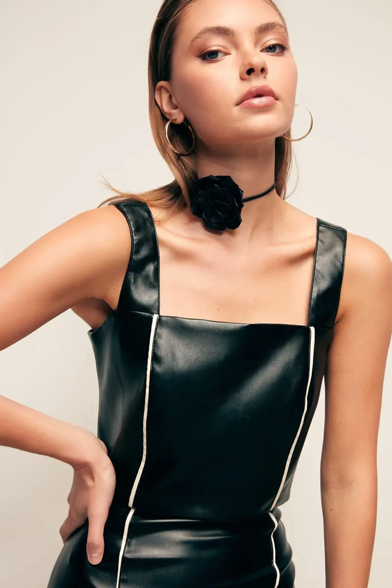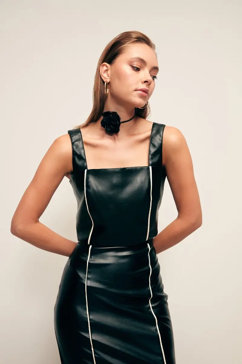 Топ с контрастной кожей, сочетающий в себе элегантность и смелость, станет новой любимицей вашего гардероба. Изготовленный из мягкой высококачественной кожи, этот топ элегантно облегает ваше тело, придавая вам изысканный вид. Детали из контрастной кожи еще больше подчеркивают элегантный дизайн топа, а его кроп-модель придает современный и модный вид.