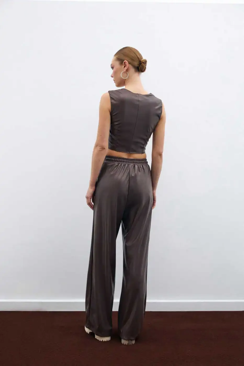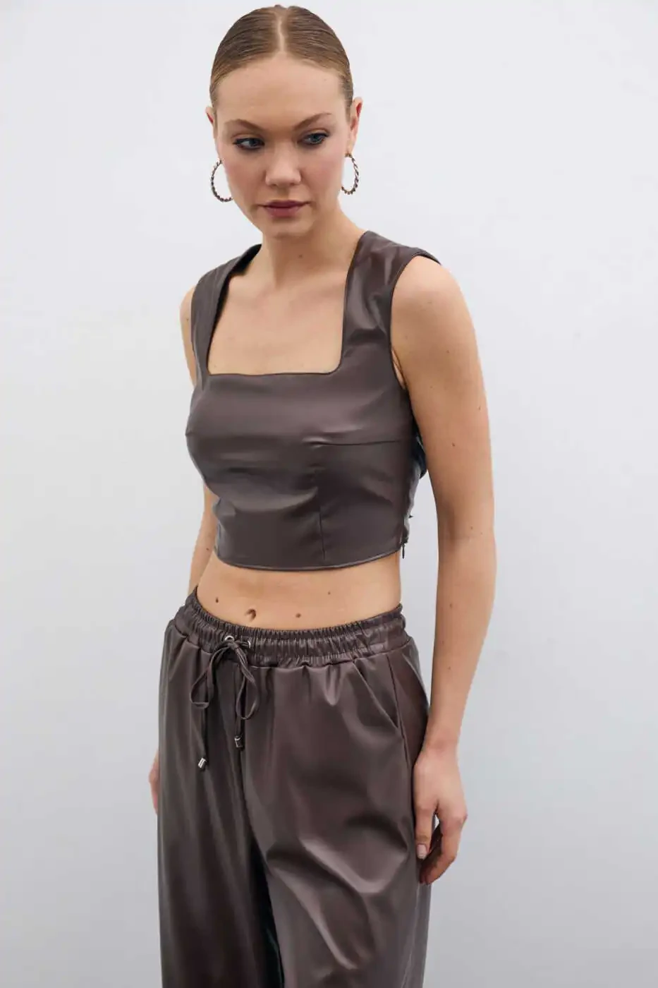 кожаный топ-кроп, квадратный вырез, топ-кроп, темно-коричневый, кожаный топ, женская одежда, мода, тренд, стильный, современный, комбинация