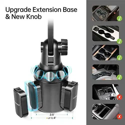 [Upgrade Extendable Pole]: More stable and height adjsutable pole. A jointed pole for 270°easy movement further enhance your vision and operability. 360° rotatable for desired position vertical or horizontal mode on our cup holder cell phone holder. It can ensure safe driving whether you are talking, navigating, listening to music or charging. This would make an awesome New Year gift! Your father will love it. [Easy & Quick Installation]: Cup phone mount is Adjustable and fits firmly and perfectly,securely in the cup holder for car, truck or SUV, fitting to varying size cup holders in your vehicle. Featuring one-button release side arms and convenient holder legs. For those who have a car, this is worth having. It is the most reassuring choice to give this as a gift to someone you care about. [Strong, stable & Durable]: Made with an adjustable heavy base and durable plastic, the phone holder will securely lock in your cup holder. The curved arm and 2 holding feet provide all-around protection for your phone and protect the devices from damage; It can hold your phone without concern for your phone moving as you drive. The holder has soft holder grips/backing will not scratch your device. [Broad Compatibility]: Suitable for all types of 2.01' - 3.54' wide devices, such as IPhone 16 /16 Pro/16 Pro Max/15/14/13/12/11/XR/8/7 Plus/6s, Galaxy S10/S9+/S8 Plus/S7 Edge/Note9, Huawei, HTC, LG, MOTO, GPS, PSP, Google Pixel, Nexus, Nikia, etc. [NOTE]: Phone holder cannot fit the phone with battery case, support maximum 0.51" thickness device,The maximum size of the Phone cradle-holders base is the diameter 4“, Please carefully compare the size of the car cup holder and the product before purchase to ensure that this product can be placed in the car cup holder.