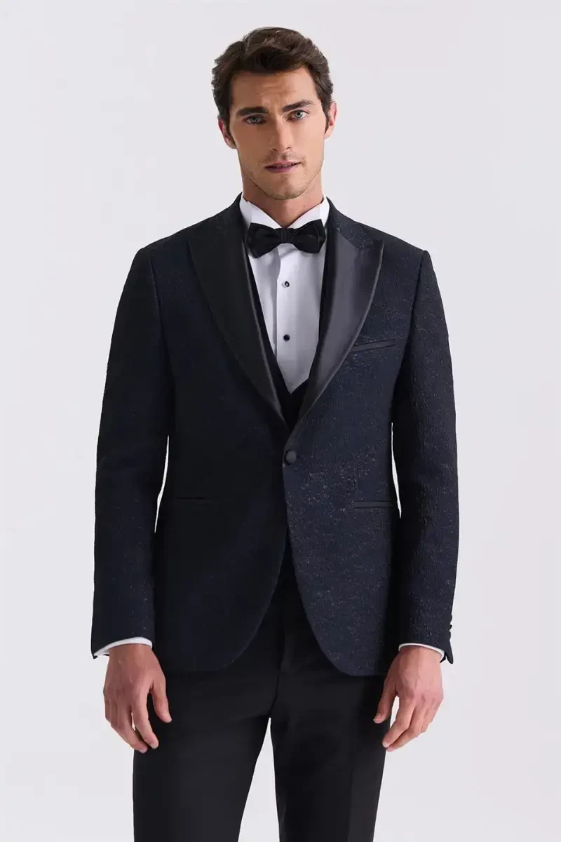 Quyuq koʻk rangdagi smokin, slim fit smokin, oʻtkir yoqali smokin, jiletli smokin, maxsus kunlar uchun smokin