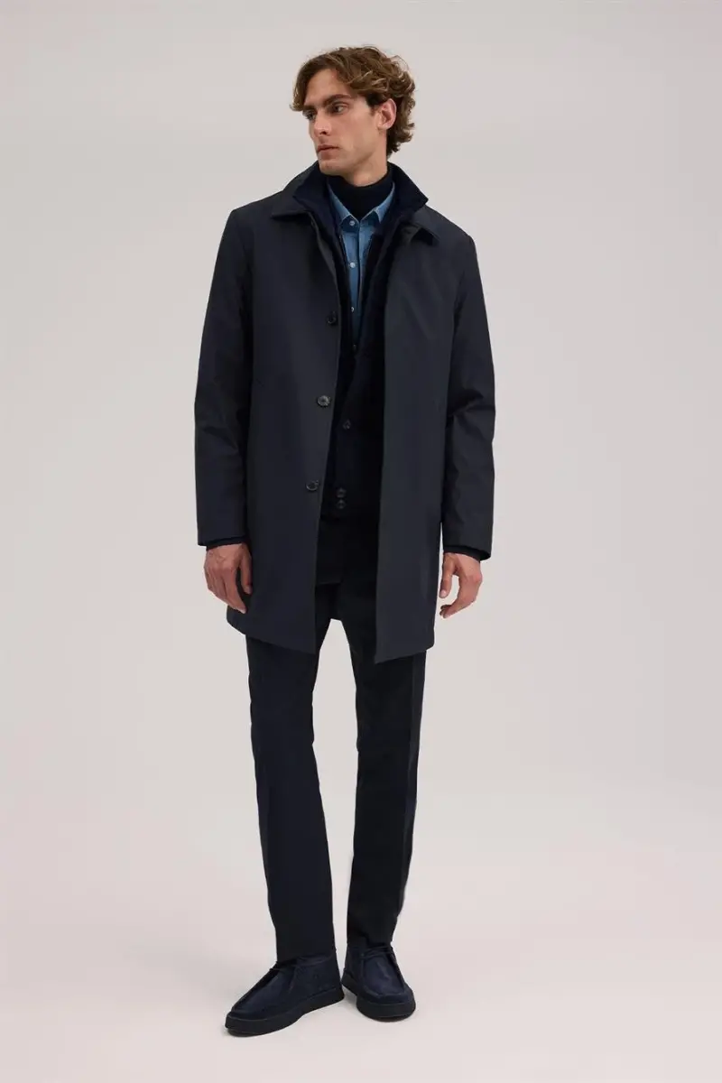 To'q ko'k rangli Comfort Fit Nehru yoqasidagi berkitish tugmachali palto: uslubli va qulay