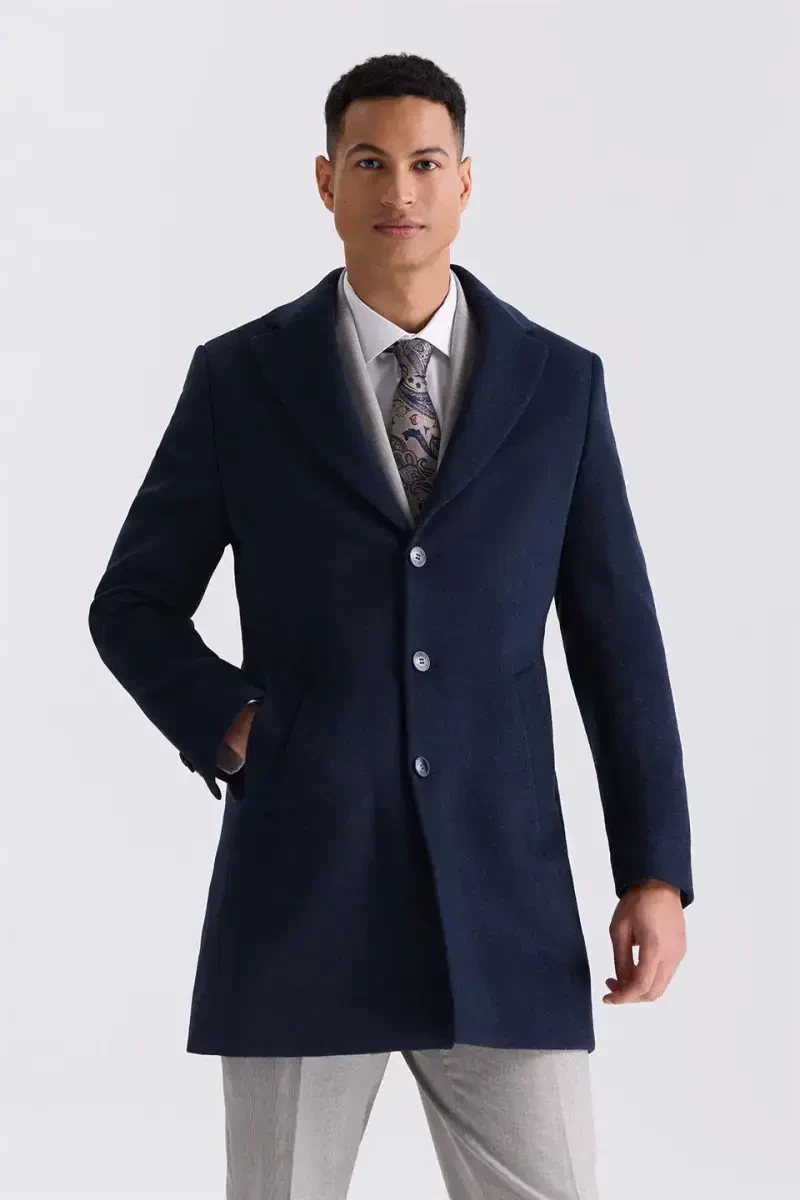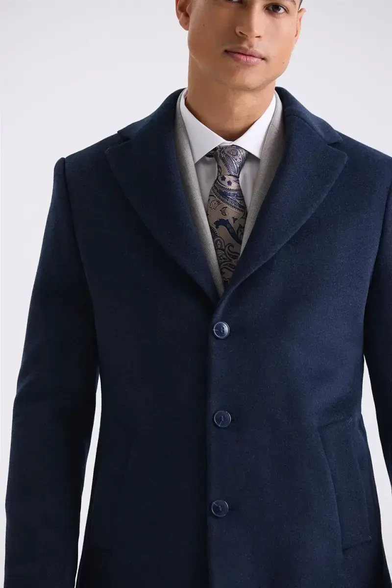 Toʻq koʻk Regular Fit Mono yoqali jun kaşmir palto | Oʻziga xos va issiq