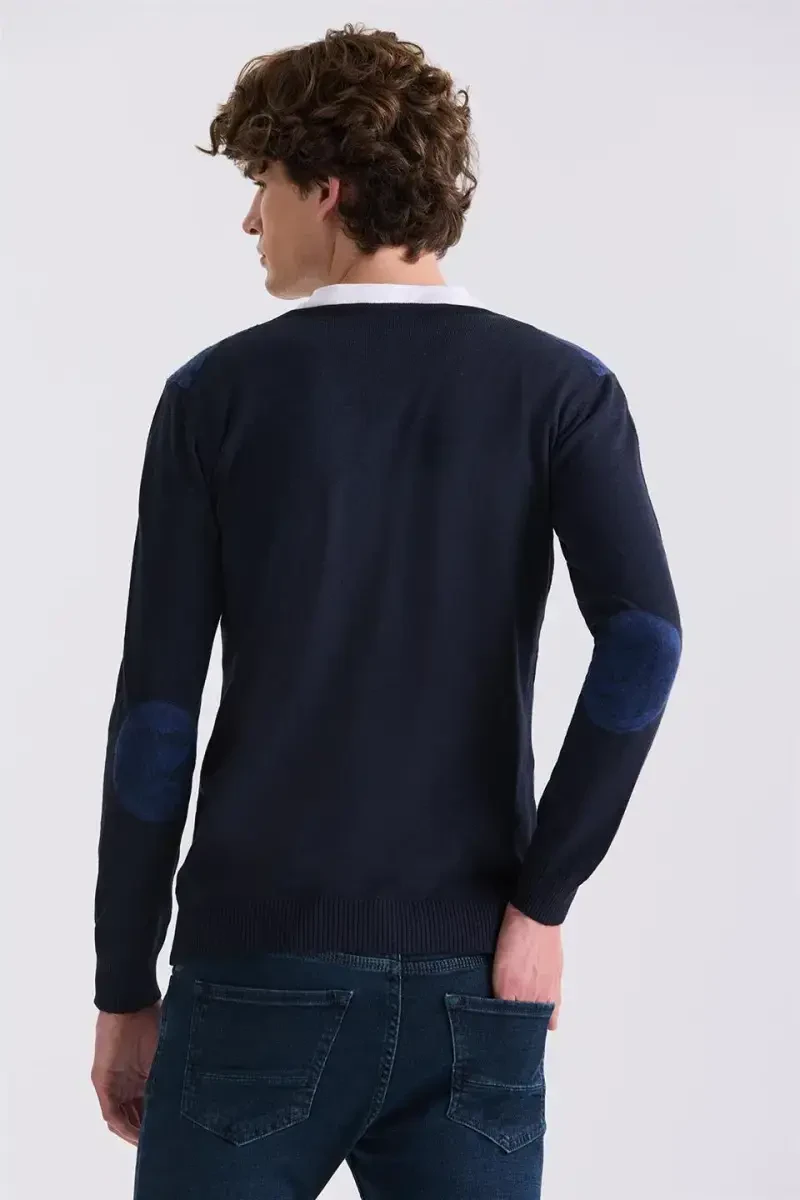 Toʻq koʻk rangli Slim Fit V Yاقة Трико свитер, Zamonaviy Triko свитер, Naqshli Triko свитер