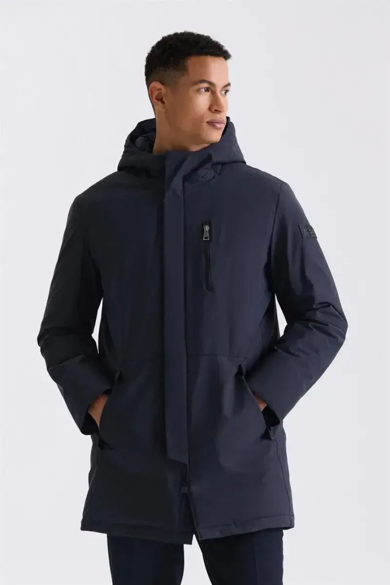 To'q ko'k rang qishki kurtka, comfort fit kurtka, kaputli qishki kurtka, yashirin fermuarlı kurtka, qishki sovuqqa qarshi kurashing