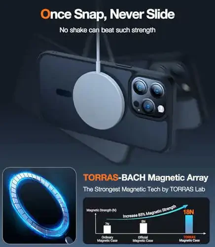 iPhone 14 Pro'ingizni zamonaviy va bardoshli tarzda himoya qilish uchun mo'ljallangan TORRAS Stronger Magnetic iPhone 14 Pro Qopqoqi, harbiy darajadagi tushish sinovlaridan o'tgan va MagSafe aksessuarlari bilan mukammal moslik uchun kuchli magnitlarga ega.