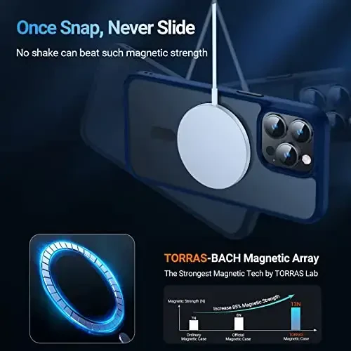The TORRAS Stronger Magnetic iPhone 14 Pro case offers a perfect combination of protection and elegance for your phone. This case is designed to be fully compatible with MagSafe accessories and securely protects your phone from drops, scratches, and impacts. The clear navy blue color preserves the original design of your iPhone 14 Pro, while the matte silicone surface is resistant to fingerprints and scratches. With the TORRAS Stronger Magnetic case, your phone will be both safe and stylish.This case features a built-in magnetic ring that perfectly aligns with MagSafe chargers. This provides a stronger connection and faster wireless charging. Thanks to the TORRAS-BACH Magnetic Array, the case firmly attaches to magnetic accessories and provides 85% more magnetic force compared to other magnetic cases. This feature allows you to securely use your phone with car mounts, wallets, and other MagSafe-compatible accessories.The TORRAS Stronger Magnetic iPhone 14 Pro case offers military-grade protection. With its special 3rd generation X-SHOCK technology-enhanced corners, 360° airbags inside, and 4-layer TPU bumper, it protects your phone from drops up to 12 feet. These features allow the case to exceed the MIL-Grade PROT standard. Additionally, the 1.2mm screen bezels and 0.8mm camera edges protect your device from dust and scratches.With its slim profile and skin-friendly touch, the TORRAS Stronger Magnetic iPhone 14 Pro case maintains the elegance of your phone while providing maximum protection. Thanks to the patented Airbag Tech and ergonomic design, the case offers maximum protection with minimum thickness. The upgraded Nano Oleophobic Coating provides resistance to fingerprints and scratches, while the soft silicone edge bumper offers a unique touch feeling.The TORRAS Stronger Magnetic iPhone 14 Pro case features an innovative design with independent buttons. These buttons are more sensitive and easier to press than cases with standard built-in designs. Always providing a click feel and pleasant tactile feedback, these buttons make using your phone a more enjoyable experience. We offer 3 different colored buttons for you to create your own style, and you can easily change these buttons whenever you want.The TORRAS Stronger Magnetic iPhone 14 Pro case offers seamless compatibility with the iPhone 14 Pro 6.1 inch. Please check your phone model before purchasing. If you encounter an incorrectly sized case, used packages, or any issues that do not meet your expectations, please contact us through TheModazoneMessage Center and you will receive support within 6 hours. The case also comes with a 180-day manufacturer's warranty.