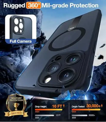 Introducing the revolutionary TORRAS Upgraded 360° Rotatable Stand Magnetic Shockproof Case, designed for your iPhone 16 Pro! This case is specifically engineered to offer ease of use and versatility while protecting your phone from all angles. The TORRAS product development team has created a unique design in the market by adding a 360° rotatable stand and full camera protection to our original magnetic shockproof case after 365 days of meticulous research and testing. Now you can protect your phone from drops, scratches, and other daily hazards while enjoying hands-free use.This case not only protects your phone but also simplifies your life. With the 360° rotatable stand, you can easily switch between portrait and landscape mode to boost your productivity at home or on the go. The stand offers adjustable angles between 25° and 135°, providing you with the most comfortable viewing experience. Moreover, the stand does not add any bulk to your case and is extremely durable.TORRAS surpasses existing 360° magnetic stand cases by separating the 360° rotating stand from the magnet to ensure a safe, fast, and stable charging experience. This case is compatible with MagSafe accessories, allowing you to easily attach accessories such as a magnetic wallet, car mount stand, wireless charger, credit cards, or keychains. However, please note that it is not compatible with the wireless charger/charging pad for Tesla.This 360° rotatable stand case is not only stylish, sturdy, and durable but also allows you to wirelessly charge your phone seamlessly. You can use the magnetic charger without any obstruction while keeping your phone upright during video calls or video games, making it visible and easy to use.In addition to 16FT Military-Grade Protection, TORRAS has also upgraded the precise camera cover to protect the camera lens from collisions, scratches, and other damages. Now you don't have to worry about dropping your phone on hard surfaces or accidentally landing on expensive cameras. Furthermore, the cutouts align perfectly with all ports and do not obstruct the use of the camera and flash.This multi-functional case is only compatible with the iPhone 16 Pro 6.3 inch. Besides offering stand capability from any angle, it can also be used as a phone grip to stabilize your hold when taking selfies. Additionally, this concealable stand has a unique design, so you won't feel any bulk on the surface when it's folded. For any issues, please contact us through the message center. A satisfying solution is promised forever.