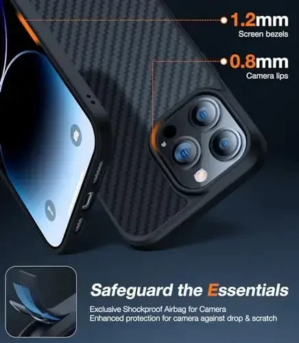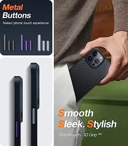 TORRAS Upgraded Stronger Magnetic for iPhone 14 Pro Case is a special case designed for your iPhone 14 Pro, combining superior protection and aesthetic appearance. This case not only protects your phone against impacts but also optimizes your wireless charging experience by providing seamless compatibility with MagSafe accessories. The premium aramid fiber material used on the back of the case gives a luxurious feel while the unique 3D Grip Technology allows you to hold your phone securely in your hand. The heat and friction resistant structure of aramid fiber ensures that the case is long-lasting and resistant to deformation. TORRAS Upgraded Stronger Magnetic for iPhone 14 Pro Case has passed military standard drop tests and provides superior protection against drops up to 12 feet. The 3rd generation X-SHOCK technology located at the corners and the 360° airbags inside maximize shock absorption. The TPU bumper offers an extra layer of protection with its four-layer structure. The slim profile of the case preserves the sleek look of your phone, while the raised bezels around the screen and camera provide extra protection against scratches. Thanks to the Nano Oleophobic Coating, this case is resistant to fingerprints and scratches, offering a silky and smooth touch feeling. TORRAS Upgraded Stronger Magnetic for iPhone 14 Pro Case offers ease of use and sensitivity with its independent metal buttons. You can reflect your personal style with three different colors of interchangeable buttons. Thanks to TORRAS-BACH Magnetic Array technology, it provides a safe usage experience by holding onto MagSafe accessories 100% more powerfully. This case offers a perfect combination of protection, style, and functionality for your iPhone 14 Pro.
