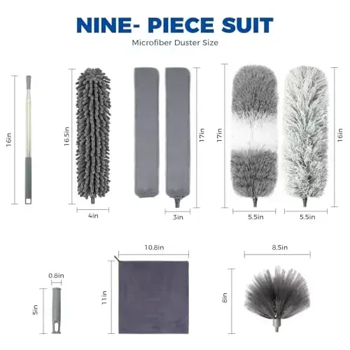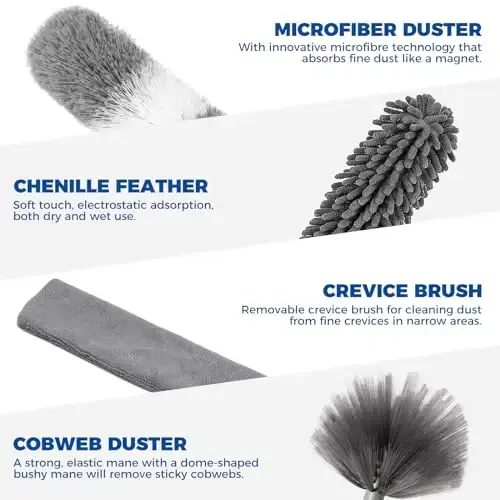 Uyingizni tozalashni osonlashtiradigan va har bir burchakka yetib borishga imkon beradigan 4 qismli tozalash to'plami bilan tanishing! Ushbu to'plam 2 tasi 1 da mikro tolali chang yig'uvchi va kengaytiriladigan oraliq tozalagich bilan birga keladi. Yuqori sifatli mikro tolali materialdan tayyorlangan ushbu to'plam uyingizning har bir qismini, poldan shiftgacha tozalash uchun zarur bo'lgan hamma narsani o'z ichiga oladi. Ikkita xil chang yig'ish boshi (egiluvchan mikro tolali patli chang yig'ish boshi va oraliq chang yig'ish boshi) va almashtiriladigan cho'tka chang matolari tufayli, turli sirtlardagi chang, kir va allergenlarni samarali tozalashingiz mumkin. Ayniqsa, yetib borish qiyin bo'lgan joylar uchun mo'ljallangan oraliq tozalagich, karavot osti, divan orasi, konditsionerlar, muzlatgichlar kabi tor va yetib borish qiyin bo'lgan joylardagi kirlarni osongina tozalashga yordam beradi. Mikro tolali patli chang yig'uvchi esa elektron jihozlaringiz, mebellaringiz, bezak buyumlaringiz, derazalaringiz, shift ventilyatorlaringiz, lampochkalaringiz va hatto avtomobilingiz ichini changdan tozalash uchun idealdir. 30 dyuymdan 100 dyuymgacha cho'zilishi mumkin bo'lgan zanglamaydigan po'lat tutqichi tufayli, zinapoyaga chiqishingiz yoki egilib bukishingizga hojat qolmasdan yuqori nuqtalarga osongina yetib borishingiz mumkin. Ushbu kengaytiriladigan xususiyat, shuningdek, saqlash qulayligini ta'minlaydi va keraksiz joy egallamaydi. Mikro tolali chang yig'ish boshlari va oraliq tozalagich boshini osongina olib tashlash va tozalash mumkin. Mikro tolali boshlarni suv bilan yuvib shamollatib quritishingiz mumkin. Oraliq tozalagichdagi mikro tolali matolar esa qo'lda yoki mashinada yuvilishi mumkin. Bundan tashqari, oraliq cho'tkasi bilan birga keladigan ikkita mato chizig'idan mebellarni artish uchun ho'l yoki quruq holda foydalanish mumkin. Spiral naqshli interfeys dizayni tufayli, chang yig'ish va oraliq tozalagich boshlarini osongina echib o'rnatishingiz mumkin. Ushbu xususiyat, turli vositalar o'rtasida o'tishni yoki saqlash joyidan tejashni juda osonlashtiradi. Agar xohlasangiz, to'plamni osib ham saqlashingiz mumkin. Ushbu ko'p qirrali tozalash to'plami, uy ishlaringizni osonroq, xavfsizroq va samaraliroq qilishga yordam beradi.