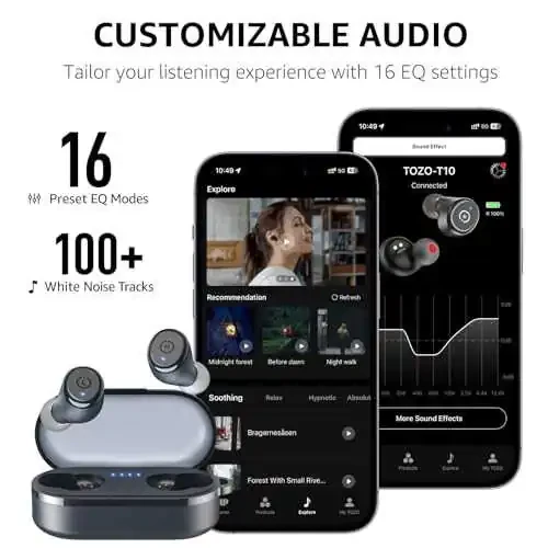 Compatible with the TOZO App, you can freely switch between 32 EQ modes and explore various styles of music. Personalize your listening experience by adjusting specific frequencies to bring you an auditory feast, plus you can adjust the touch settings yourself.