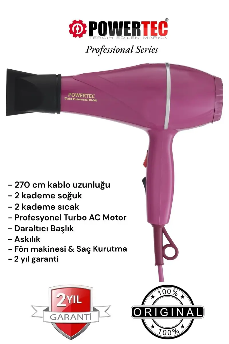 Bu ürün Powertec Türkiye tarafından gönderilecektir.Kampanya fiyatından satılmak üzere 100 adetten fazla stok sunulmuştur.İncelemiş olduğunuz ürünün satış fiyatını satıcı belirlemektedir.Bir ürün, birden fazla satıcı tarafından satılabilir. Birden fazla satıcı tarafından satışa sunulan ürünlerin satıcıları ürün için belirledikleri fiyata, satıcı puanlarına, teslimat statülerine, ürünlerdeki promosyonlara, kargonun bedava olup olmamasına ve ürünlerin hızlı teslimat ile teslim edilip edilememesine, ürünlerin stok ve kategorileri bilgilerine göre sıralanmaktadır.Bu üründen en fazla 10 adet sipariş verilebilir. 10 adedin üzerindeki siparişleri Trendyol iptal etme hakkını saklı tutar. Belirlenen bu limit kurumsal siparişlerde geçerli olmayıp, kurumsal siparişler için farklı limitler belirlenebilmektedir.15 gün içinde ücretsiz iade. Detaylı bilgi için [page="return_conditions"]tıklayın .Yüksek performanslı bay ve kuaförlere yönelik tasarlanmış olup 2 kademeli sıcaklık ve 2 kademeli hız ayarı vardır210 °C sıcaklığa ulaşır1800 & 1900 Watt Turbo AC motor gücüne sahip olup 2500 watt performans göstermektedirMükemmel sıcaklık ve üfleme sağlamaktadır270 cm. kablo uzunluğuna sahiptir ve yerli üretimdirResmi distribütör garantilidirPowertec TR501 fön makinesi nitelikleri ile kullanıcılara hayalindeki saça kavuşmasını sağlarJhonson motor kullanan fön makinesi , sıcaklık ve üfleme özellikleri ile yüksek performans sunarEsnek dış yüzeyi sayesinde olası düşme ya da darbelere karşı dayankıklı olduğunu kanıtlarSınıfının minimum elektrik harcayan fön makinesi maddi olarak da avantaj sağladığı için ekonomik bir ürün olduğunu gösterirKablo uzunluğu fön makinesini konforlu bir şekilde kullanmanızı sağlar