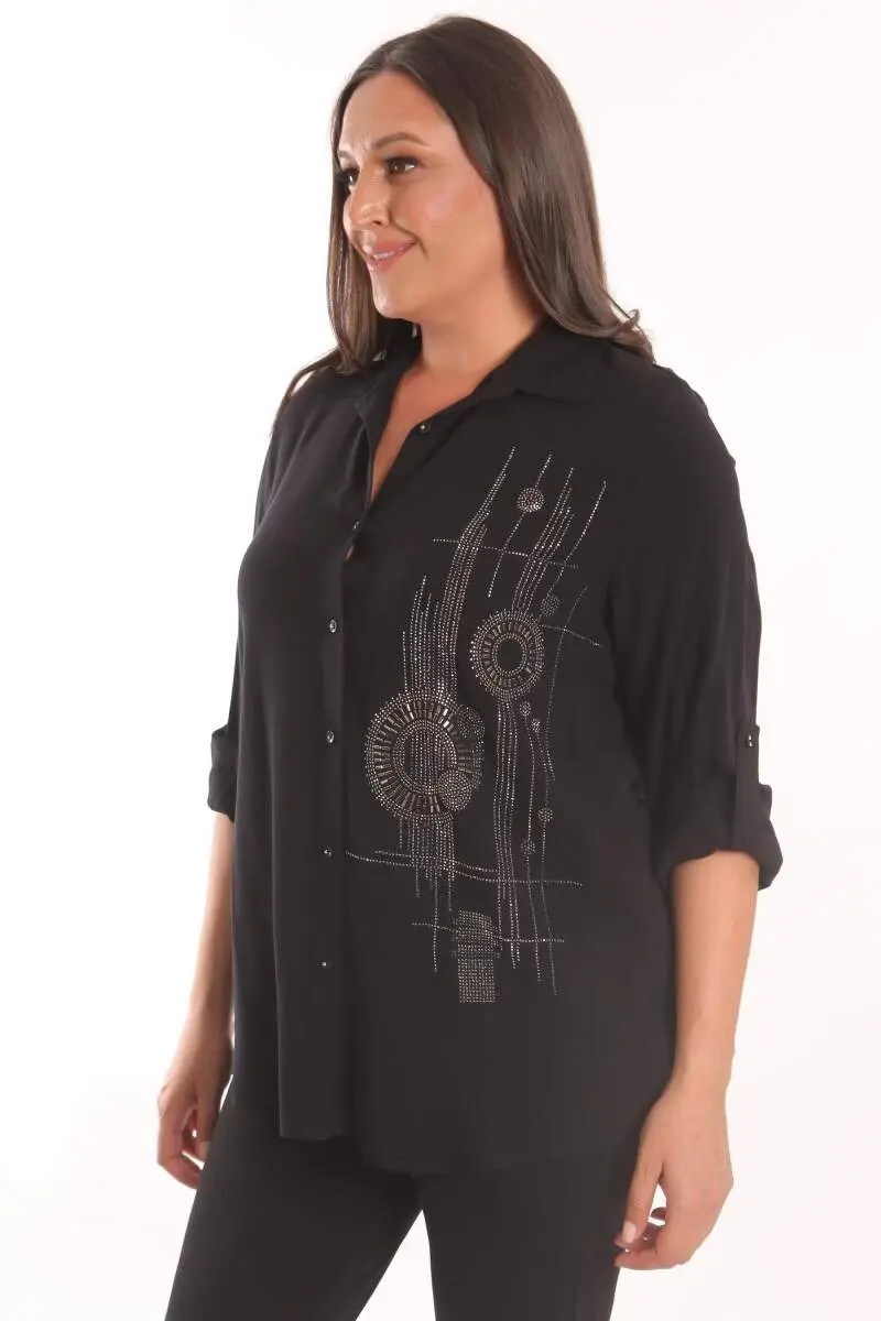 Trend42plus Большой Размер Черная Рубашка | Рубашка Тканая с Каменной Печатью