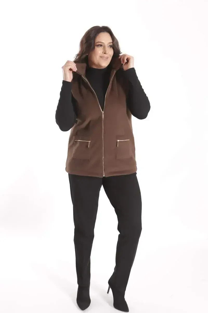 Модель коричневого жилета Trend42plus большого размера из кашемира с карманами на молнии гарантирует стиль в холодную погоду благодаря приятной и мягкой текстуре. Он предлагает продвинутый уровень элегантности благодаря положению воротника, удобному крою и детали молнии спереди.