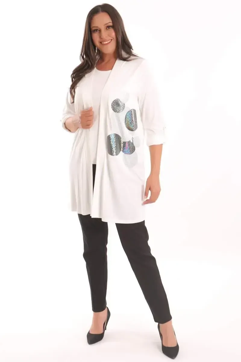 Renk: Ekru. Malzeme: %70 Viskoz - %30 Poliester. Manken Ölçüleri: Omuz: 47 cm. - Göğüs: 97 cm. - Basen: 105cm - Bel: 80 cm. - Boy: 1,80 cm. Ürün boyu 100 cm. 'dir. Model Bedeni: 44