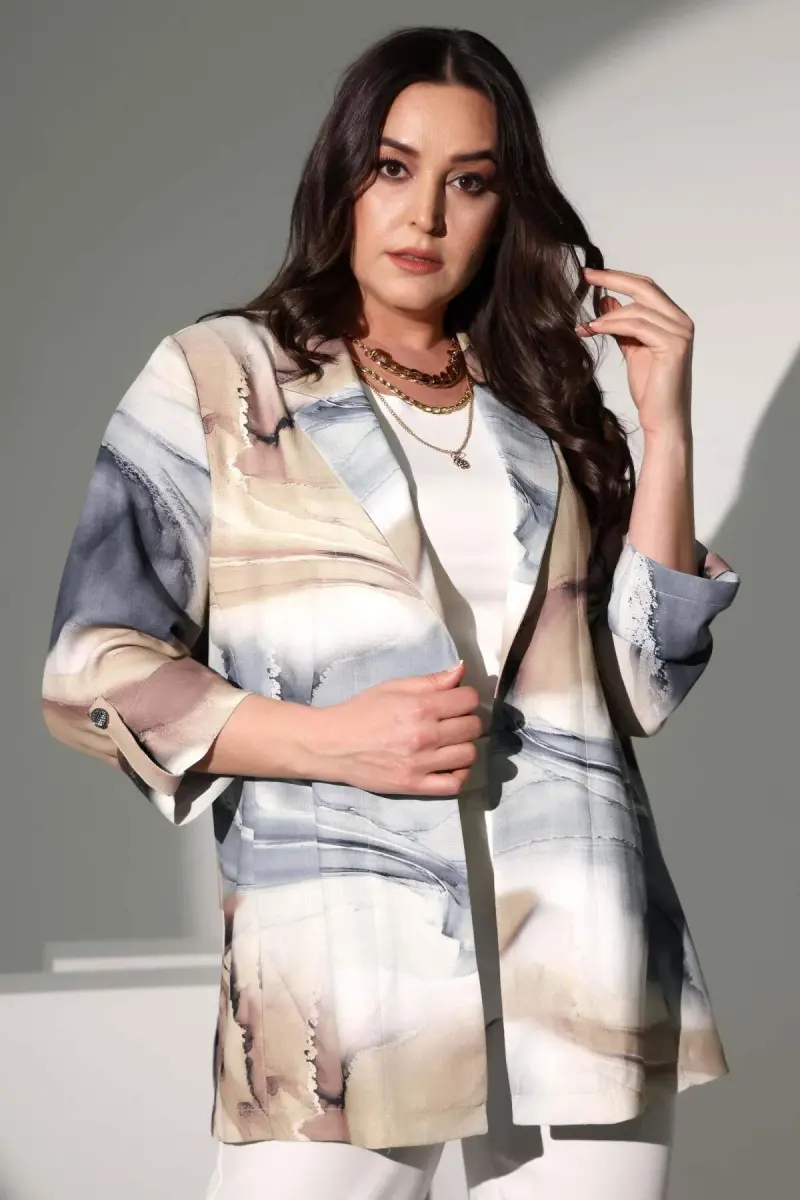 Пиджак большого размера Trend42plus с батиковым рисунком, двубортный, серого цвета — стильный и удобный элемент гардероба, который выделит вас. Современный батиковый рисунок в сочетании с изысканным оттенком серого создает вневременную элегантность. Двубортный воротник придает пиджаку классический и элегантный вид, а также красиво подчеркивает фигуру. Благодаря свободному крою вы можете носить его с комфортом в течение всего дня. Длина до бедер отлично сочетается как с брюками, так и с юбками. Погоны на рукавах и пуговицы добавляют пиджаку яркий и привлекательный штрих. Боковые разрезы не стесняют движений и создают стильный вид. Материал из 100% полиэстера делает пиджак прочным и легким в уходе. Этот пиджак идеально подходит для женщин больших размеров, которые хотят чувствовать себя комфортно, не жертвуя стилем, как в повседневной жизни, так и в особых случаях. Сочетайте его с элегантной блузкой и туфлями на каблуке для создания эффектного образа. Этот пиджак, который можно легко носить в офисе, на встречах или особых мероприятиях, станет незаменимой частью вашего гардероба. Выразите свой стиль и уверенность в себе с помощью двубортного серого пиджака большого размера Trend42plus с батиковым рисунком. Выделяйтесь благодаря ткани с рисунком и стильным деталям, наслаждаясь комфортом в течение всего дня благодаря свободному крою.