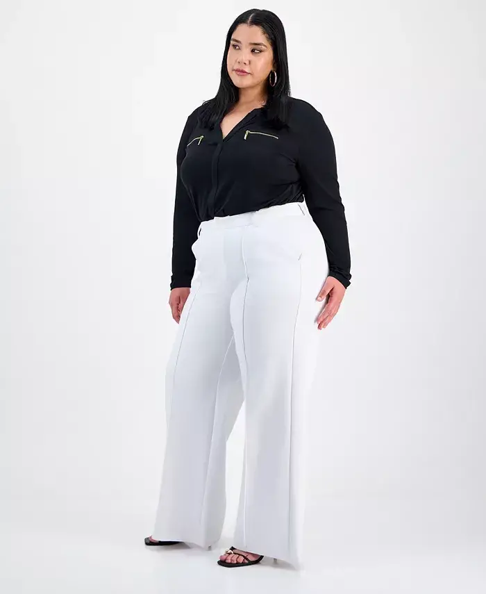 Trendy Plus Size High-Rise Wide-Leg Ponté-Knit Pants, designed in collaboration with Modazone, are the perfect choice for plus-size women looking for a modern and comfortable style. These pants gracefully emphasize the silhouette with their high-waisted design, while the wide-leg cut offers freedom of movement. The softness and flexibility of the Ponté knit fabric provide a comfortable wearing experience all day long. Whether for your daily activities or a special dinner, these pants are set to become an indispensable part of your wardrobe, completing your elegance. Specially designed for Modazone, these pants have been carefully produced to meet the expectations of women who follow trends and do not want to compromise on comfort. The high-quality Ponté knit fabric offers long-lasting use, while the easy-to-combine structure of the pants allows them to easily match with different tops. You can reflect your style by combining it with a stylish blouse or a sporty t-shirt. These pants not only look stylish but also make you feel good when you wear them. The high-waisted detail helps you achieve a fitter look by gathering the abdominal area, while the wide legs make the legs look longer and thinner. Thanks to the different color options, you can choose the one that best suits your style and make a difference in any environment. Enjoy being both stylish and comfortable with Trendy Plus Size High-Rise Wide-Leg Ponté-Knit Pants.