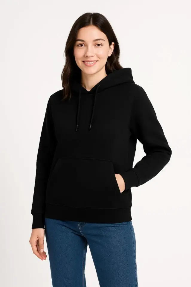 Толстовка с капюшоном и карманом-кенгуру из трехниточного трикотажа - Черный - это дизайн, сочетающий в себе стиль и комфорт, и является кандидатом на то, чтобы стать незаменимой частью вашего гардероба. Эта толстовка с капюшоном идеально подходит для повседневного использования и согревает вас благодаря качественной трехниточной ткани, а также обеспечивает долговечность. Благородный и неподвластный времени черный цвет легко сочетается с любым нарядом и дополняет ваш стиль. Дизайн с капюшоном защищает вашу голову в холодную погоду, а карман-кенгуру предлагает практичное решение для согрева рук или переноски мелких предметов. Собираетесь ли вы заниматься спортом, встречаться с друзьями или отдыхать дома, эта толстовка с капюшоном всегда будет с вами. На модели изделие размера M/38. Размеры модели следующие: Рост: 165 см, Вес: 55 кг, Грудь: 90 см, Талия: 72 см, Бедра: 100 см. Эта информация может дать вам представление о том, как изделие будет выглядеть на вас. Трехниточная структура придает толстовке прочность, а мягкая текстура обеспечивает комфорт в течение всего дня. Дизайн капюшона можно регулировать в соответствии с вашими личными предпочтениями благодаря регулируемым шнуркам. Карман-кенгуру - это одновременно практичная и стильная деталь. Черный цвет легко сочетается с одеждой разных стилей. Эту толстовку с капюшоном можно легко сочетать с джинсами, спортивными штанами или леггинсами, и это универсальная вещь, которую можно носить в любое время года. Толстовка с капюшоном и карманом-кенгуру из трехниточного трикотажа - Черный - это идеальный выбор для тех, кто ищет стиль и комфорт в одном лице, и она готова стать фаворитом вашего гардероба!