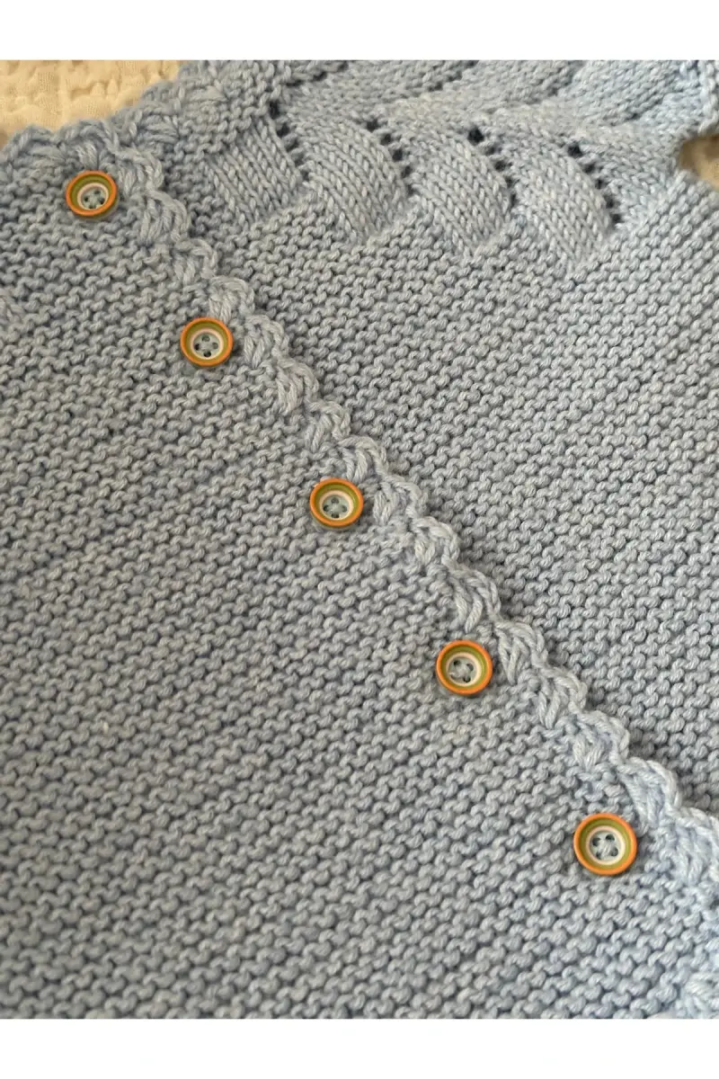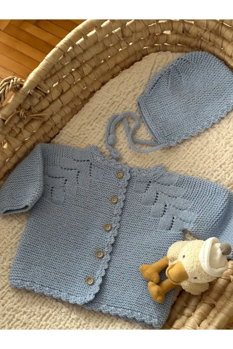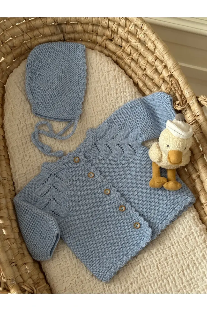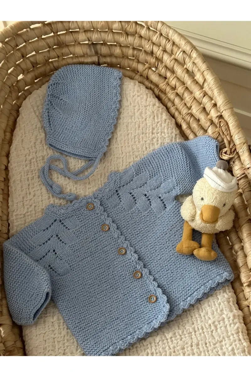 Triko Ajurlu Bebek Hırka Ve Şapka Seti - El Örgüsü-Mavi
