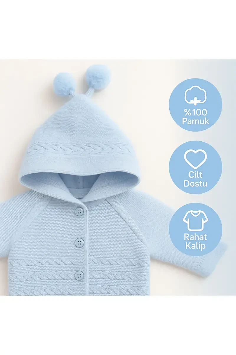 Triko Kapüşonlu Çift Katlı Kız - Erkek Bebek Hırka, miniklerin hassas ciltleri düşünülerek özenle tasarlanmış, konfor ve şıklığı bir araya getiren bir üründür. Bebeğinizin gün boyu rahat etmesini sağlayan yumuşak triko kumaşı, aynı zamanda dayanıklılığıyla da ön plana çıkar. Çift katlı yapısı, soğuk havalarda ekstra sıcaklık sağlayarak bebeğinizin üşümesini engeller. Bu hırka, bebeğinizin hem günlük aktivitelerinde hem de özel günlerinde rahatlıkla kullanabileceği çok yönlü bir seçenektir. Kapüşonlu tasarımı, bebeğinizin başını rüzgardan ve serin havalardan korurken, modern ve sevimli bir görünüm kazandırır. Ön kısımda yer alan düğmeler, giydirme ve çıkarma işlemlerini kolaylaştırırken, hırkanın şıklığını tamamlar. Mavi rengi, hem kız hem de erkek bebekler için uygundur ve farklı kıyafetlerle kolayca kombinlenebilir. Triko Kapüşonlu Çift Katlı Bebek Hırka, bebeğinizin gardırobunun olmazsa olmaz parçalarından biri olacak, hem ebeveynlerin hem de bebeklerin beğenisini kazanacaktır. Bebeğinizin konforu ve sağlığı ön planda tutularak üretilen bu hırka, güvenle tercih edebileceğiniz bir üründür. Yumuşak dokusu sayesinde bebeğinizin cildini tahriş etmez ve alerjik reaksiyonlara neden olmaz. Ürünün üretiminde kullanılan malzemeler, bebeğinizin sağlığına zarar veren hiçbir madde içermez. Bu sayede, bebeğinizin hassas cildi için en uygun seçenektir. Hırkanın kolayca yıkanabilme özelliği, ebeveynler için pratik bir kullanım sunar. Makinede yıkanabilir olması, zamandan tasarruf etmenizi sağlar ve hırkanın her zaman temiz ve bakımlı kalmasını kolaylaştırır. Triko Kapüşonlu Çift Katlı Kız - Erkek Bebek Hırka, bebeğinizin hem şık hem de rahat olmasını sağlayan, kaliteli ve kullanışlı bir üründür. Bebeğinizin konforu ve sağlığı için güvenle tercih edebilirsiniz.