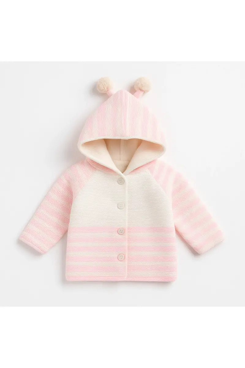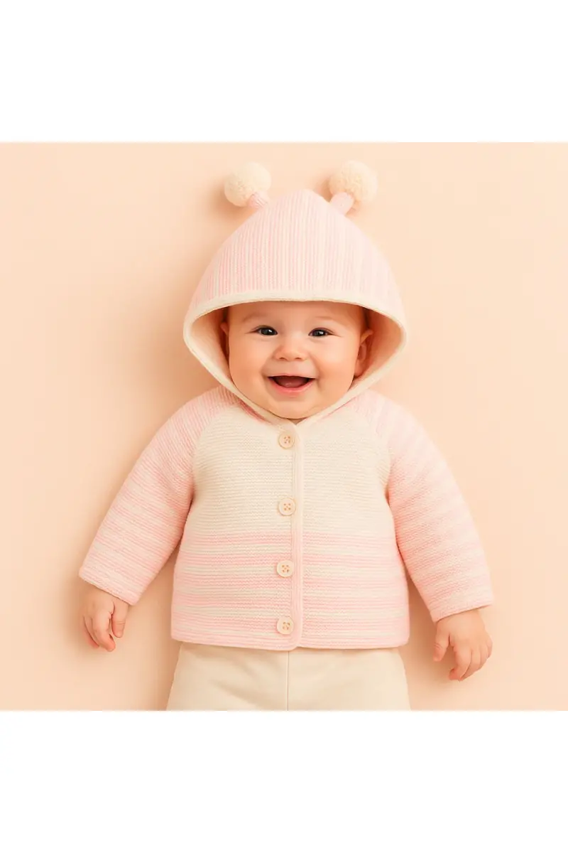 Triko Kapüşonlu Çift Katlı Kız - Erkek Bebek Hırka Mont-Bej