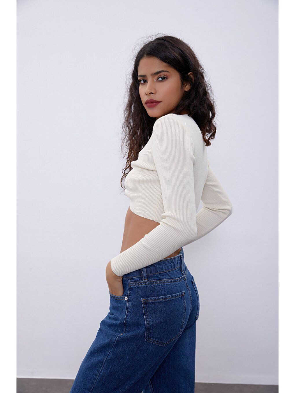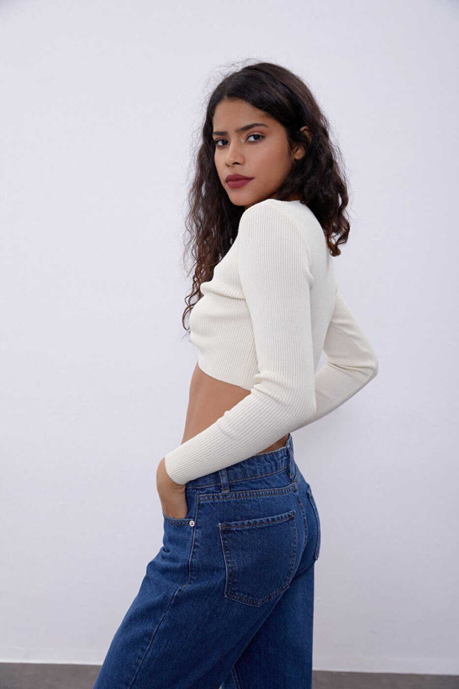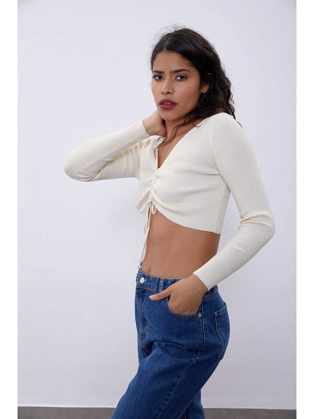 Сочетающий в себе стиль и комфорт, трикотажный свитер с V-образным вырезом и декольте на груди цвета экрю станет незаменимой частью вашего гардероба. Элегантный V-образный вырез и декольте на груди создают женственный образ, а мягкая трикотажная ткань обеспечивает комфорт на протяжении всего дня. Этот свитер, который вы можете легко выбрать как для повседневной жизни, так и для особых случаев, поможет вам добавить изысканности своему стилю благодаря различным вариантам комбинаций.