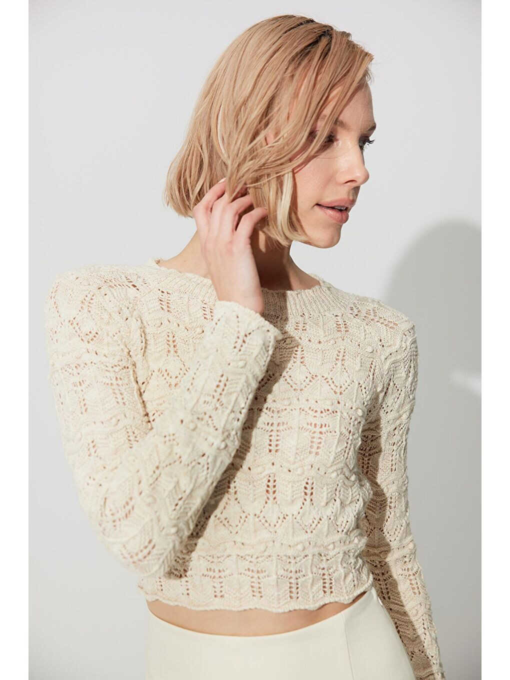 Экру трикотажный свитер с вырезом на спине и круглым вырезом — идеальный выбор для тех, кто хочет выглядеть элегантно и стильно. Благодаря мягкой и комфортной фактуре свитер станет незаменимым элементом вашего гардероба, обеспечивая комфорт в течение всего дня, сочетая в себе элегантность и удобство.