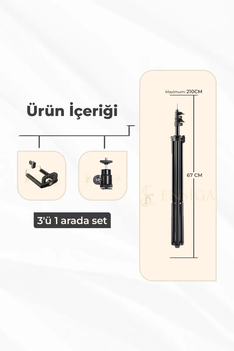Tripod 2.1 Meter 360 Rotating Head Phone Holder Ring Light Metal Light Studio Lamp Stand - TRİPOD BLACK, unleash your creativity and enjoy taking professional quality shots! This versatile tripod offers you unparalleled stability and control in both photo and video shoots, helping you take your content to the next level. Whether you are a YouTube content creator, a TikTok phenomenon, or just a photography enthusiast who wants to immortalize memories, this tripod will more than meet your needs.Product DescriptionTripod 2.1 Meter offers long-lasting and reliable use thanks to its robust metal structure. Thanks to its height-adjustable feature, you can easily adapt to different shooting angles and environments. The 360-degree rotating head is ideal for capturing panoramic shots and different perspectives. The phone holder allows you to securely fix your smartphone, allowing you to take hands-free shots. In addition, thanks to the integrated ring light feature, you always have perfect lighting. The different color temperatures and brightness levels of the ring light help you provide ideal lighting in all kinds of environments. Whether you want to create a warm and inviting atmosphere or get a clear and sharp image, with Tripod 2.1 Meter, you have all the control. This tripod is not just an accessory, but also a tool to express your creativity. Thanks to its compact and portable design, you can easily take it anywhere and perform studio-quality shots wherever you want. Whether you are doing indoor portrait shots or outdoor landscape photos, you will always achieve professional results with Tripod 2.1 Meter. It's time to say goodbye to shaky and blurry images. With Tripod 2.1 Meter, you can create sharp, clear and impressive content and amaze your viewers. This tripod, which is the choice of professional photographers and video content producers, offers you the same quality results. Remember, a good tripod is not just equipment, but also the basis of a successful shoot. Take your shots to the next level and make a difference with Tripod 2.1 Meter!Product Features* Adjustable height up to 2.1 meters* 360 degree rotating head* Solid metal construction* Integrated ring light (different color temperatures and brightness levels)* Smartphone holder* Compact and portable design* Easy installation and use* Stable feet that prevent vibration* Suitable for both photo and video shootsAdditional InformationPlease read the user manual carefully before using your tripod. The ring light's power supply is provided via USB. Clean it regularly and keep it away from humid environments for long-lasting use of the product.