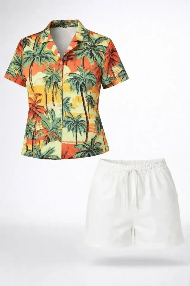 Tropikal Palmiye Desenli Kısa Kol Gömlek Şort Takım Yazlık Rahat - Desenli