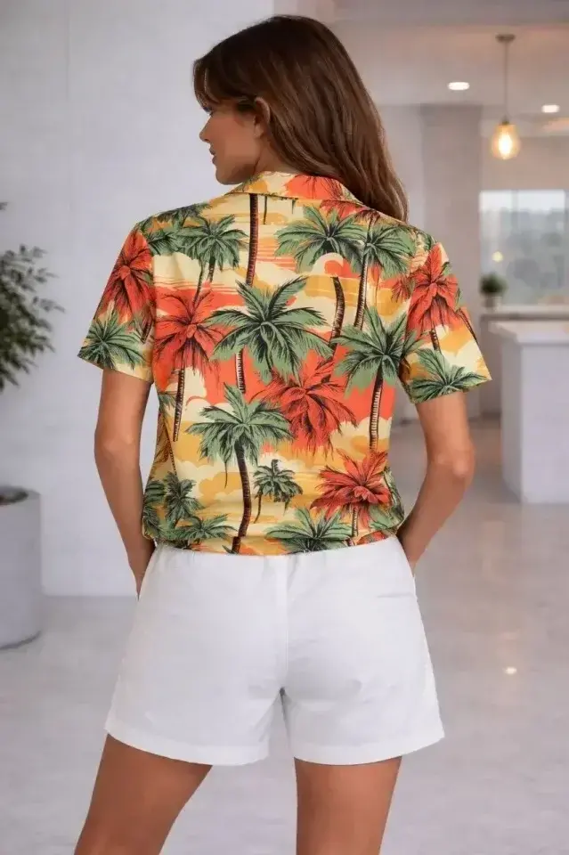 Tropikal Palmiye Desenli Kısa Kol Gömlek Şort Takım Yazlık Rahat - DesenliModelin Ölçüleri: Boy: 165, Kg: 55, Göğüs: 90, Bel: 72, Kalça: 100Modelin üzerindeki ürün M/38 bedendir