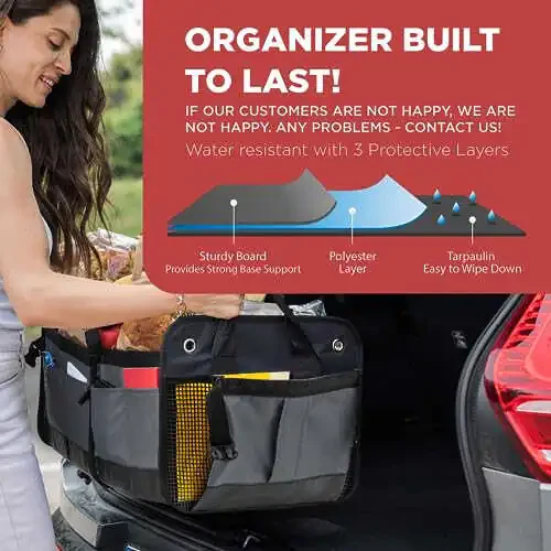 SIMPLY THE BEST - LeClassiqueShop, presents the highly anticipated, unique and EXCLUSIVE trunk organizer to the Trunk Crate Pro (TC-Pro) (Patented) brand. Our car storage organizer is an Eco-Friendly professional grade, Heavy Duty Material trunk organizer with straps: Best for suv, car, truck, auto, jeep, mini van, vehicles in Automotive Interior Car Accessories. It is hand crafted using premium highest grade Oxford Polyester material. Size is 23.6" (L)*14.6" (W) * 12.5" (H) DURABLE - BUILT TOUGH to withstand wear and tear of vehicle use. Our car trunk organizer is manufactured with the strongest and most durable Oxford polyester fabric which can withstand the heavy use and pass the test of time. It is water resistant and abrasion resistant. It is the Everest of trunk organizers. It features reinforced stitching on areas that receive the most wear. This particular material is water resistant and makes this organizer not only durable, but easy to clean. USABILITY - EASY TO USE AND INSTALL, ANYONE CAN DO IT! Gone are the days of a messy car. Simply unfold and load any items you desire. It is one of the largest and most effective backseat organizer on the market. It has a clip and hold sub-divider, a middle sub-divider, rigid base plates and center that allows you to stay organized in your vehicle. With its well-constructed design, the organizer stays firm without any cargo in it. INNOVATIVE DESIGN AND MULTI-FACETED DESIGN – Our car organizer was designed and invented after months of testing and sampling with the best factories. It combines all the strengths and addresses the shortcomings of existing trunk organizers. It has the most pockets, 3 compartments, removable sub-dividers, can be folded half-length as a seat organizer. Finally, our car storage organizer is lightweight and fully collapsible for easy storage, and is designed to prevent your cargo from sliding.