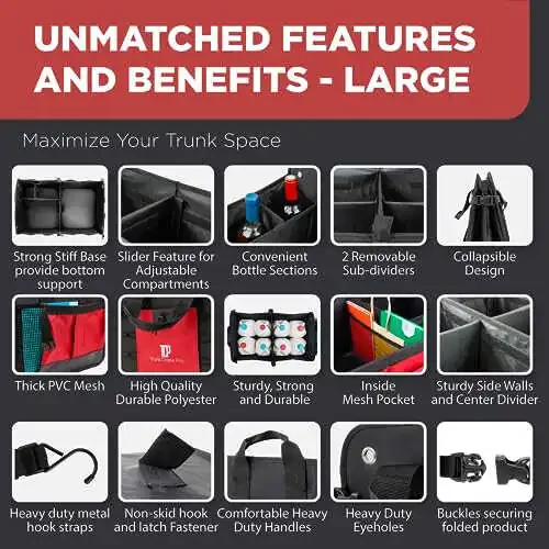 TRUNKCRATEPRO Kırmızı Araba Aksesuarları Bagaj Düzenleyici, arabanızda düzen ve düzenliliği sağlamak için mükemmel bir çözümdür. Premium malzemeden yapılmış bu katlanabilir düzenleyici, çok sayıda bölmesi ve ayarlanabilir kayışları ile araç içi eşyalarınızı organize etmenizi kolaylaştırır. Kadınlar için özel olarak tasarlanmış bu pratik düzenleyici, büyük kapasitesi ile ihtiyaç duyduğunuz her şeyi taşımanıza olanak tanır. Kaymaz tabanı ile düzenleyicinin yerinde kalmasını ve eşyalarınızın kaymasını önler.