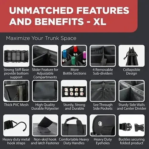 •ORGANIZE YOUR AUTO: Tired of a messy car trunk? Use our portable car organizer for organization. This car trunk organizer has 6 compartments. It’s great for groceries, emergency supplies, & more!•STURDY DESIGN: This SUV trunk organizer is made of strong 600D Oxford Polyester. It’s reinforced with sturdy base plates on all panels to give it a rigid shape. The trunk organizer is built to last.•CUSTOMIZE YOUR STORAGE: This trunk organizer for car is fully adjustable to suit your needs. Fold or remove compartments to fit larger items. The car storage organizer is perfect for any vehicle.•PREVENTS SLIDING: This truck organizer has hook and loop fasteners. This car organizer trunk storage can be secured to any compatible surface. The non-skid strips at the bottom keep it from sliding.•LARGE & COLLAPSIBLE: This trunk organizer is great for saving space. It expands to 40" x 13" x 12". When not in use, this car organizer collapses to 2.5". It’s easy to store in the car or at home.
