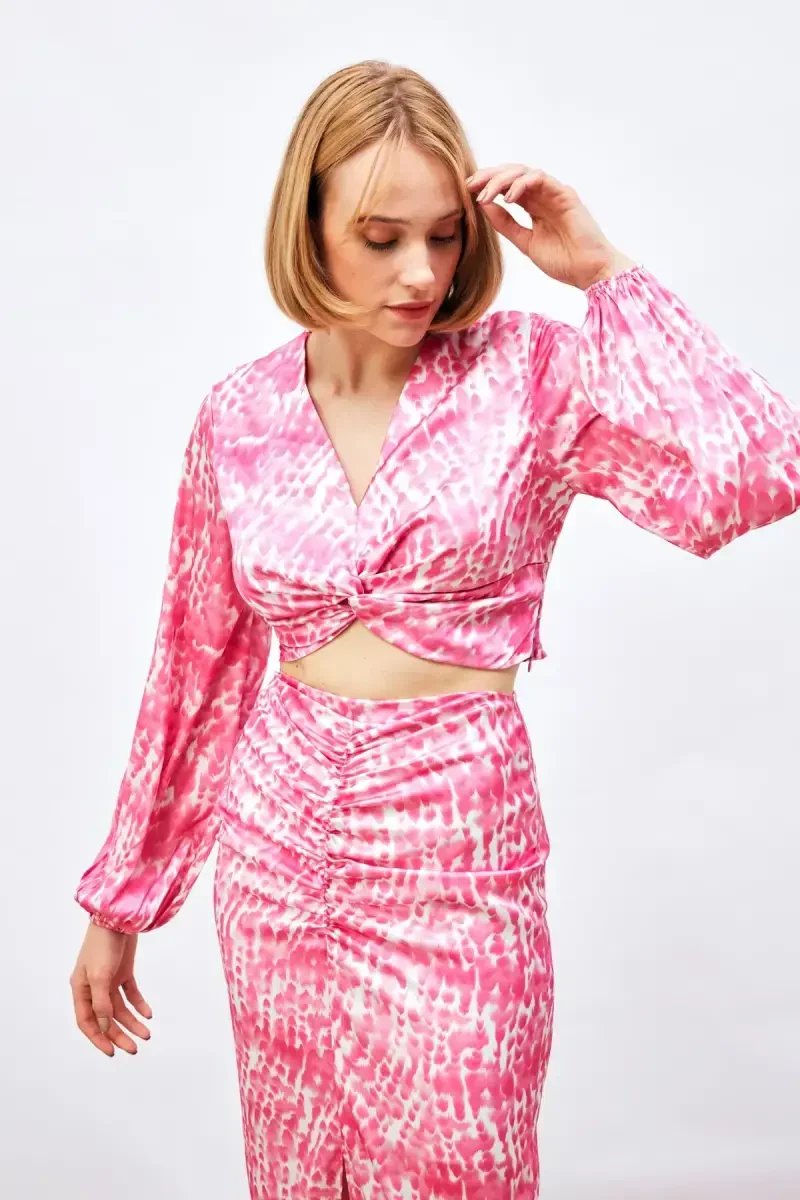 Har kuni kiyinishingizga yangi o'lcham qo'shish uchun mo'ljallangan bu bluzka o'zining nafis tugma tafsilotlari va ko'zni qamashtiradigan naqshi bilan ajralib turadi. Push rangi har qanday teri rangiga mos keladi va o'ziga xos nafislik bag'ishlaydi. Yengil va nafas oladigan matoni qulay kiyinish tajribasini ta'minlaydi. Har kuni kiyadigan kiyimlaringizga zamonaviylik qo'shish uchun ideal tanlov.